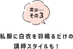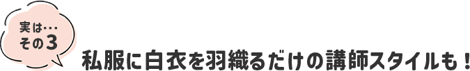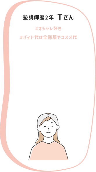 塾講師はスーツのイメージがあって、着替えるのも面倒だし私服のまま働けるところないかな~と探してたところ、見つけました!笑 私が働いている塾は私服の上に白衣を着るスタイルなので大学には好きな服を着ていってそのままバイトに行けて、楽だしオシャレも楽しめてありがたいです!
